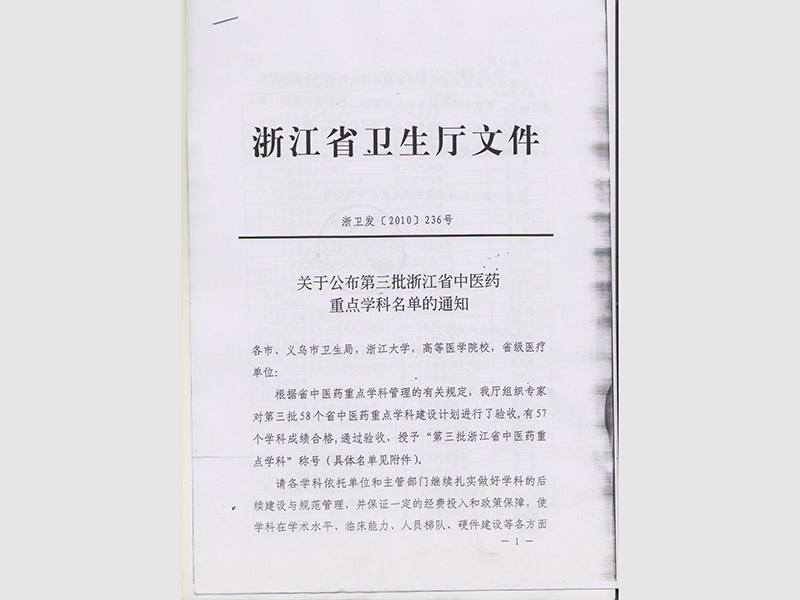 浙江省重点学科文件通知(温州中山医院序号48号)
